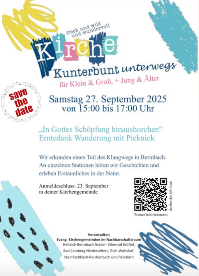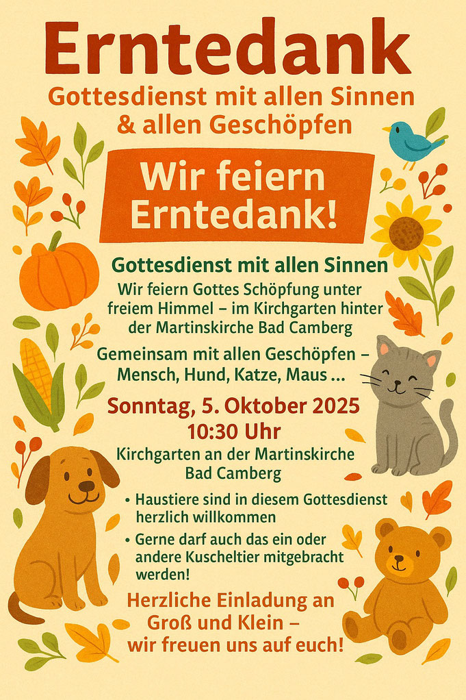 Denn Gottes Schöpfung soll dieses Mal mit allen Sinnen unter freiem Himmel im Kirchgarten hinter der Martinskirche Bad Camberg gefeiert werden gemeinsam mit allen Geschöpfen – mit Mensch, Hund,